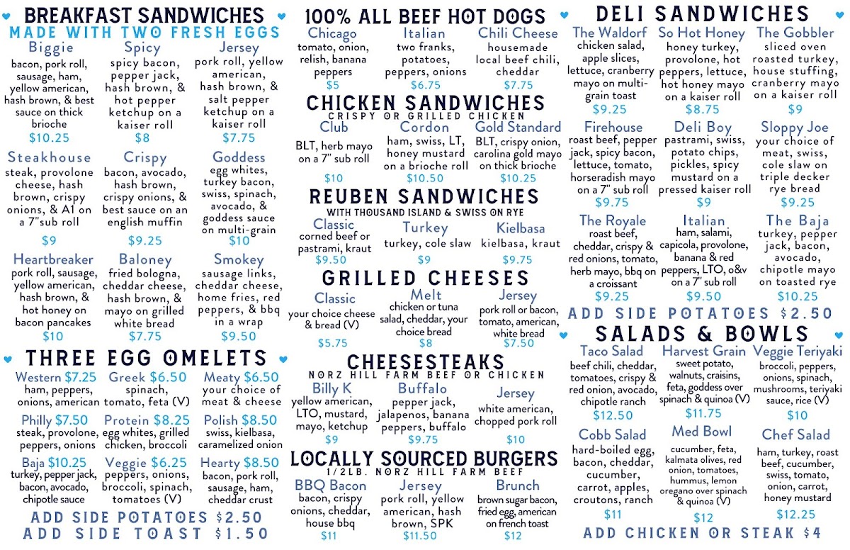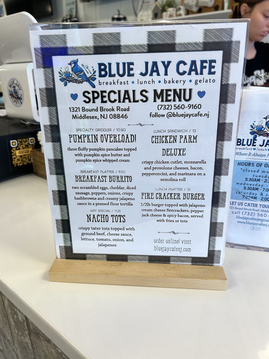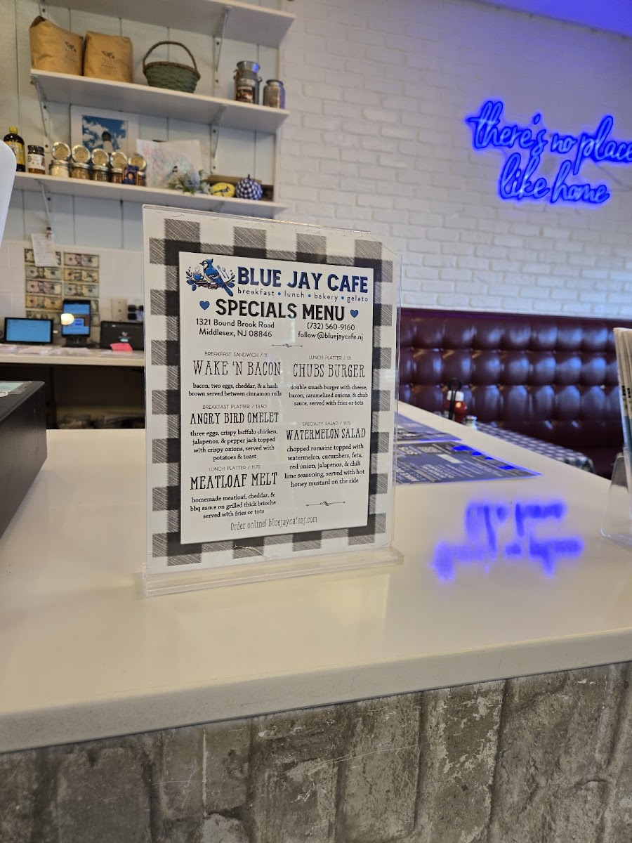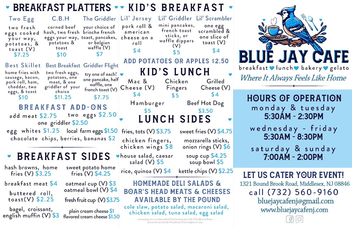 The menu at Blue Jay Cafe offers a variety of comfort food options catering to different tastes. For hot lunch sandwiches, you can indulge in the Chicken Cordon Bleu Sandwich, Kielbasa Reuben, or try their Jersey Cheesesteak. If you're in the mood for something lighter, the Harvest Grain Bowl or Veggie Teriyaki Bowl from the Salads & Bowls section will satisfy your cravings. Breakfast is a standout at Blue Jay, with tempting choices like the Veggie Omelet, Hearty Omelet, or the signature Pork Roll Egg & Cheese sandwich. Kids can enjoy classic favorites such as Chicken Fingers, Mac & Cheese, or a simple Hot Dog. For sides, the Mozzarella Sticks, Fries, and Tater Tots pair perfectly with any meal. If you're looking for a hearty breakfast, consider the CBH Platter or the Griddler Flight. And don’t forget the baked goods, with options like Banana Bread, Brownie, and Peanut Butter Brownie to satisfy your sweet tooth. Whether you're visiting for a filling breakfast or a hearty lunch, Blue Jay Cafe’s menu delivers on variety and flavor.
